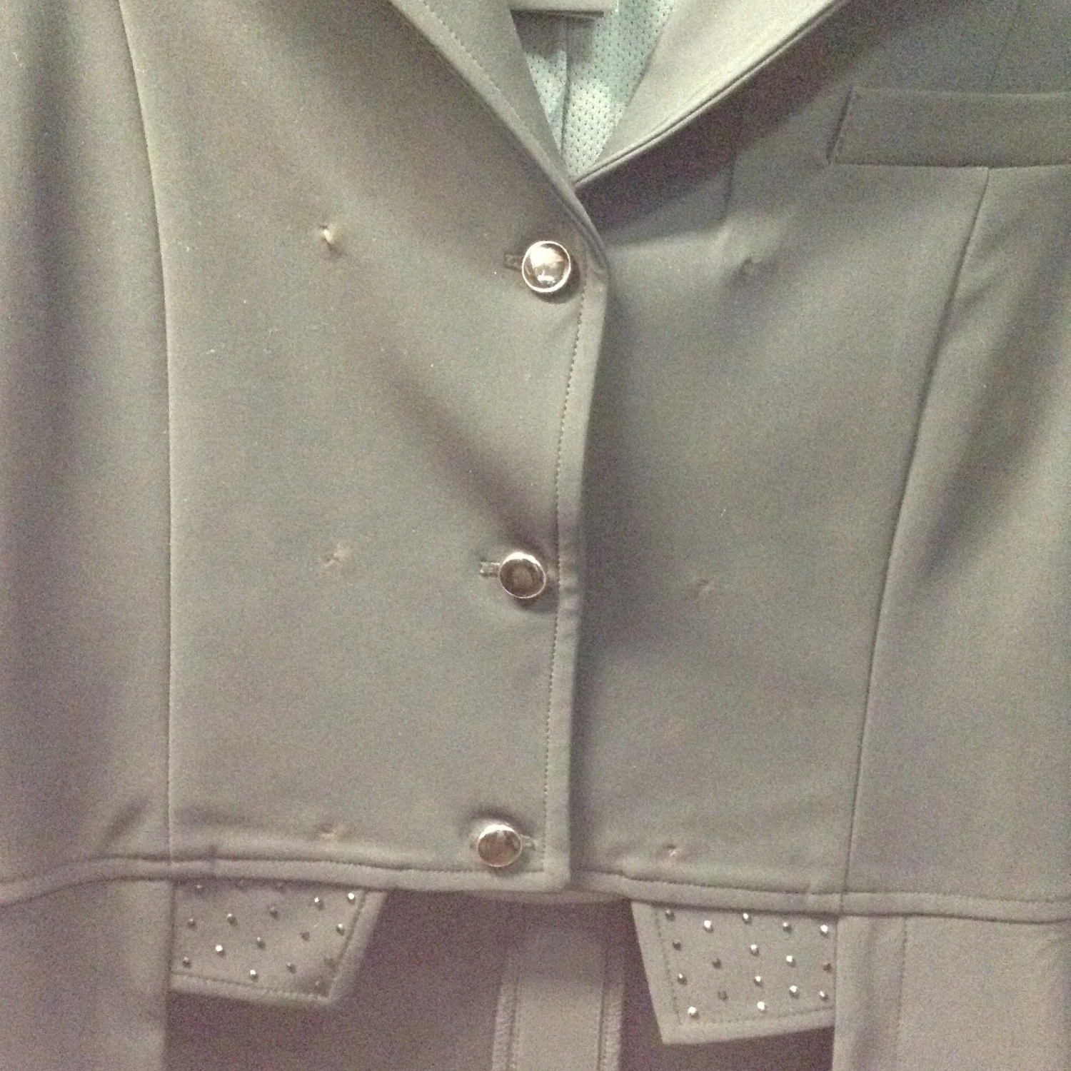 A beautiful high functional long tail coat. The long tail coat has crystals on the collar. The crystals are matching the fabric on the lower front. Double row black logo buttons makes sure it fits your body perfectly.