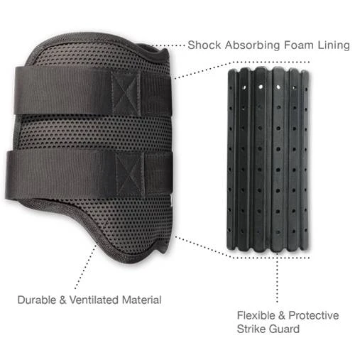 Patented material and design create the ultimate cross country boot. The mesh outer layer provides 360 degree protection with a lightweight rip stop surface that wont retain water and is breathable to aid in cooling of the legs. The non-slip lining prevents slipping and rubbing. Inside the boot is a revolutionary strike guard made from high quality TPU that is flexible and conforms to the shape of the leg, but will harden to a rigid protective wall upon impact. Sold in Front and Rear Pairs.