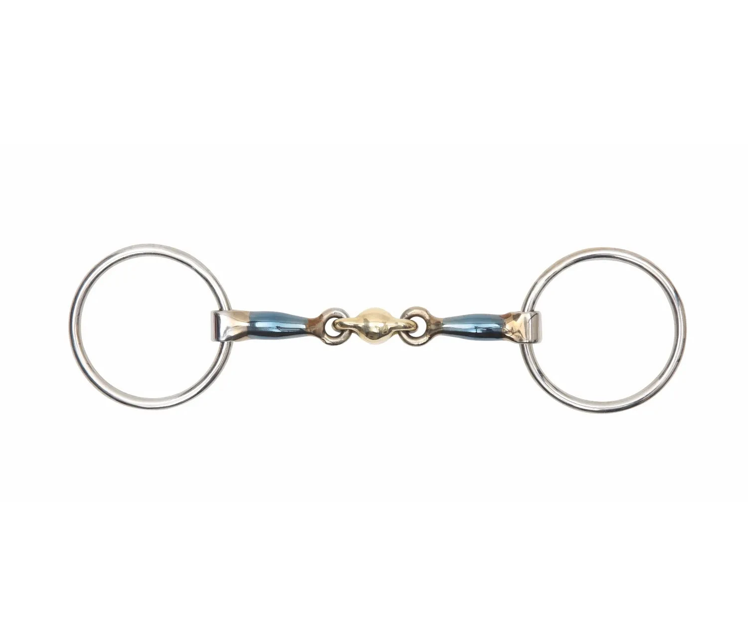 The loose ring allows more movement than a fixed cheek so that it may allow for the angle of the tongue. The brass alloy lozenge offers even pressure and encourages contact.