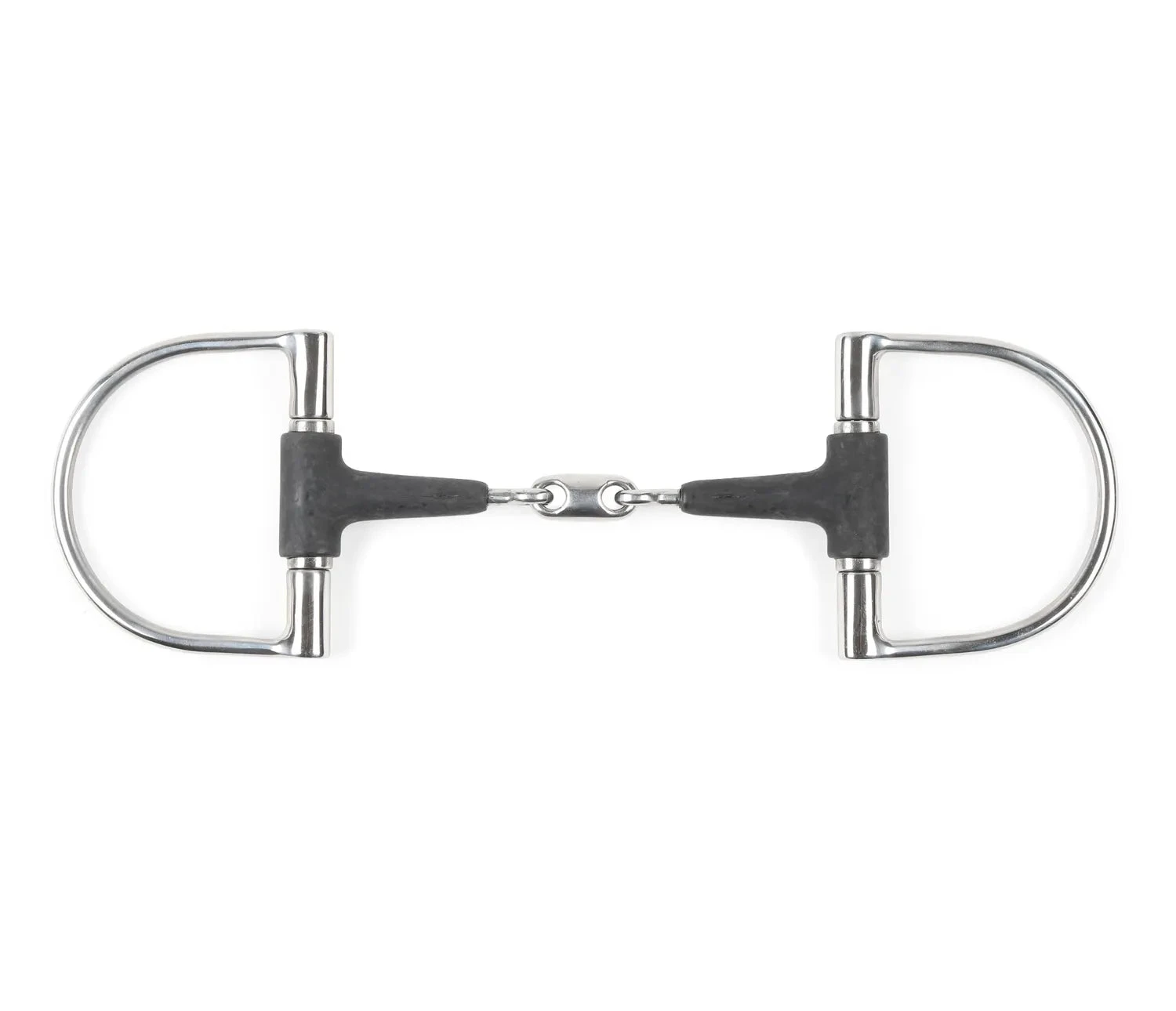 This three piece bit has a thin rubber coating, which is more mild than a traditional metal bit and is soft on the bars and lips. The lozenge lays nicely on the tounge and offers mild tongue pressure.